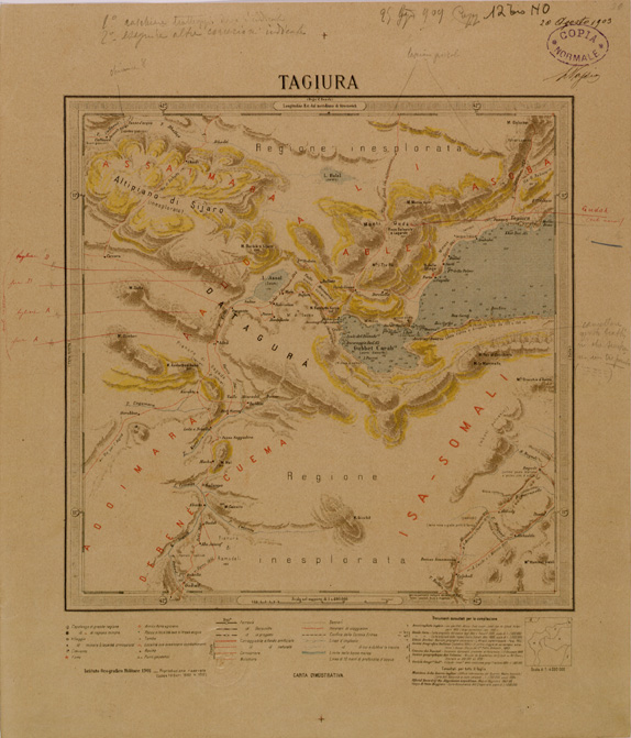 "Carta descrittiva allestita dall'I.G.M. al fine di comprendere i territori rimasti esclusi dai lavori iniziati nella Colonia Eritrea nel 1888. La pubblicazione fu iniziata nel 1897 e ultimata nel 1902. La prima edizione consta di 30 fogli di 1° longitudine per 1° di latitudine e comprende il territorio fra l' 11° e il 16° parallelo e fra il 36° meridiano e il mare. Triangolazioni I.G.M. e determinazioni astronomico-geodetiche dell'Ufficio Topografico della Marina, del geografo D' Abbadie...proiezione policentrica, sostituita dal 1896 con la Cassini, longitudini riferite a Greenwich...in seguito fu allestita una nuova edizione, ampliata al 18° parallelo, per includervi Ras Casar (18°2') e a sud fino all'11° parallelo per la zona ad oriente del 40° meridiano, comprendendo così la regione dell'Aussa ed il territorio adiacente alla baia di Tagiura."