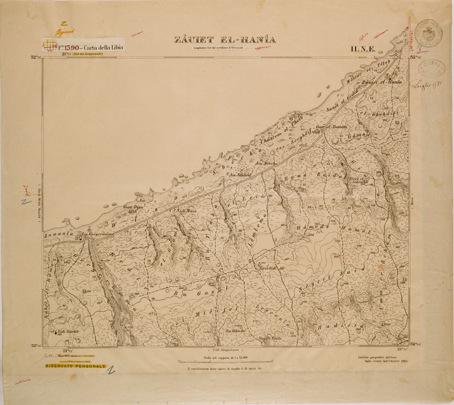 "Cirenaica 1:25.000, monocolore a penna su carta da disegno. Ingrandimento dai rilievi al 50.000 fatti per il 100.000"