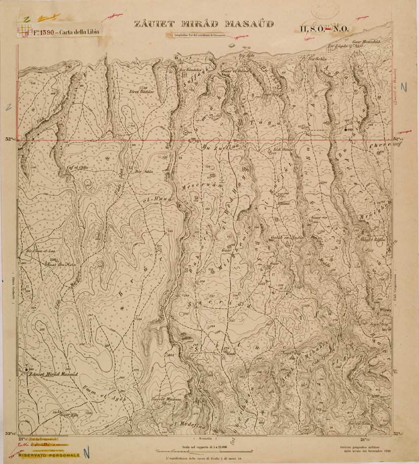 "Cirenaica 1:25.000, monocolore a penna su carta da disegno. Ingrandimento dai rilievi al 50.000 fatti per il 100.000"