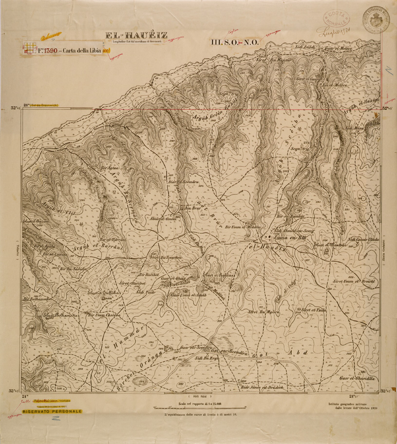 "Cirenaica 1:25.000, monocolore a penna su carta da disegno. Ingrandimento dai rilievi al 50.000 fatti per il 100.000"