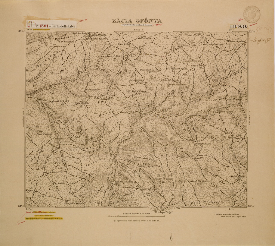 "Cirenaica 1:25.000, monocolore a penna su carta da disegno. Ingrandimento dai rilievi al 50.000 fatti per il 100.000"
