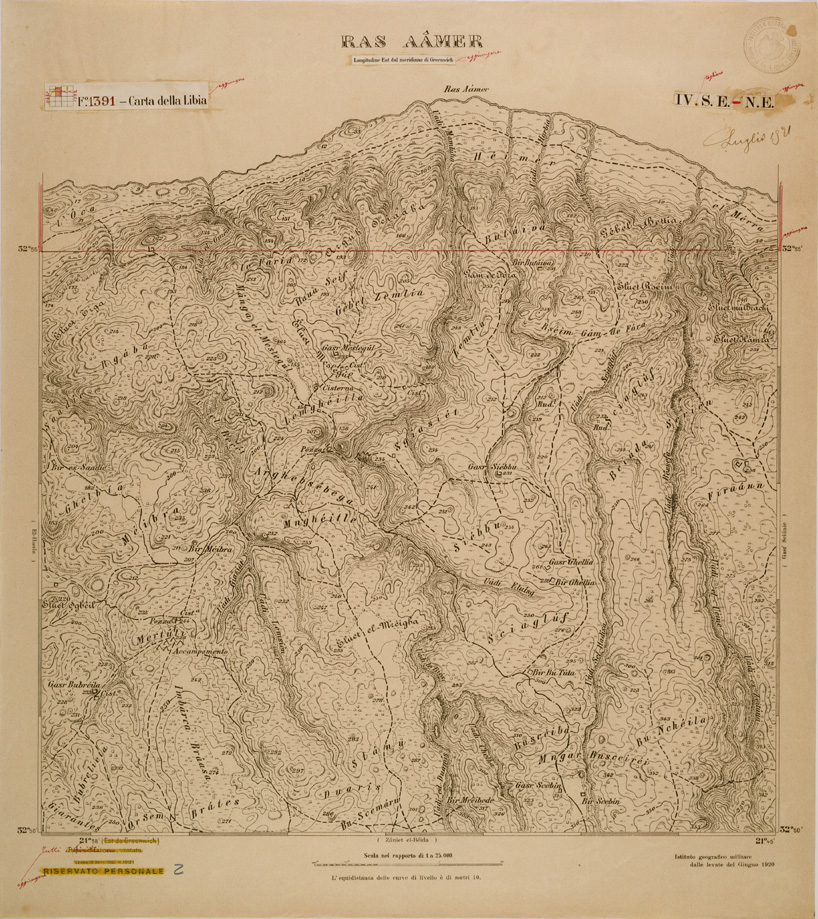 "Cirenaica 1:25.000, monocolore a penna su carta da disegno. Ingrandimento dai rilievi al 50.000 fatti per il 100.000"