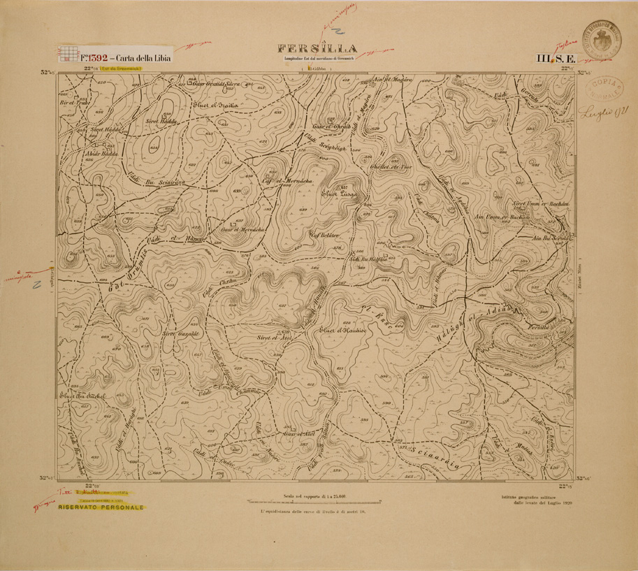 "Cirenaica 1:25.000, monocolore a penna su carta da disegno. Ingrandimento dai rilievi al 50.000 fatti per il 100.000"