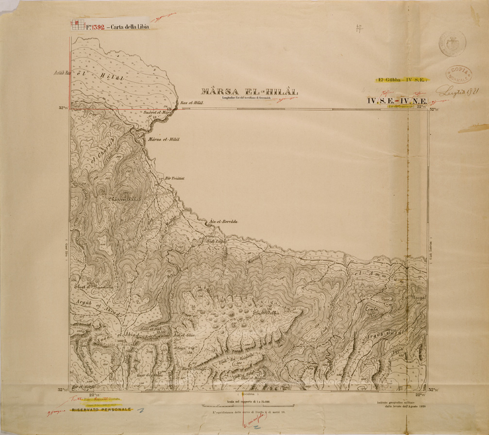 "Cirenaica 1:25.000, monocolore a penna su carta da disegno. Ingrandimento dai rilievi al 50.000 fatti per il 100.000"