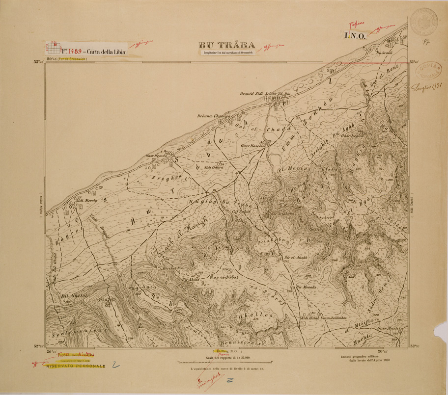 "Cirenaica 1:25.000, monocolore a penna su carta da disegno. Ingrandimento dai rilievi al 50.000 fatti per il 100.000"