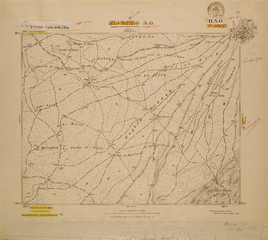 "Cirenaica 1:25.000, monocolore a penna su carta da disegno. Ingrandimento dai rilievi al 50.000 fatti per il 100.000"