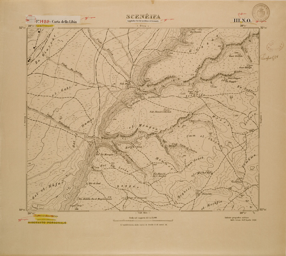 "Cirenaica 1:25.000, monocolore a penna su carta da disegno. Ingrandimento dai rilievi al 50.000 fatti per il 100.000"