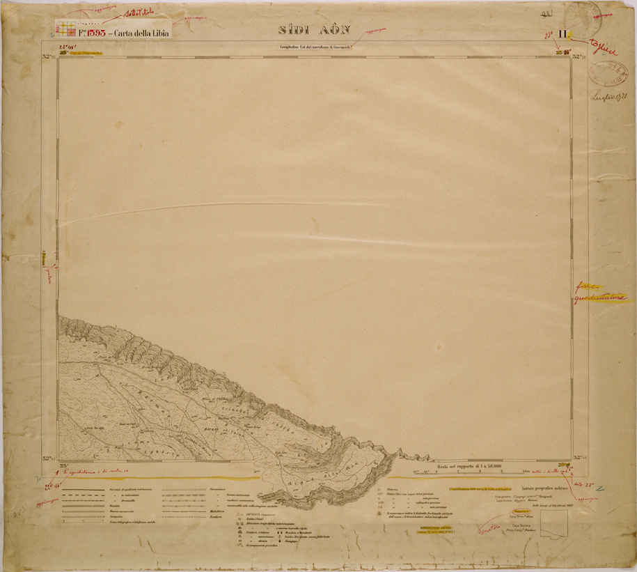 "Carta della Regione della Cirenaica, rappresenta la fascia costiera da Bengasi a Sidi Aon per circa 40 KM nell' entroterra, dei primi 20 fogli esistono anche gli originali disegnati alla scala di 1:25.000 ( stesso categorico, file da SE005607 a SE005681 )"