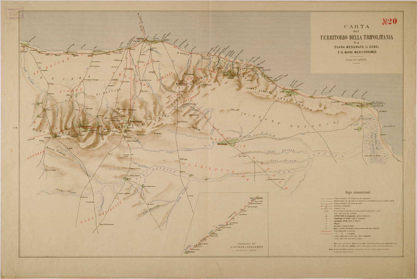 CARTA DEL TERROTORIO DELLA TRIPOLITANIA FRA SUARA, MESURATA, E IL GEBEL E IL MAR MEDITERRANEO.
