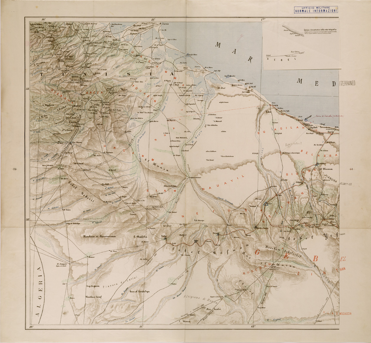 CARTA DEL TERRITORIO DELLA TRIPOLITANIA FRA LA COSTA ED IL GEBEL DAL CONFINE TUNISINO A MESRATA- FOGLIO 1