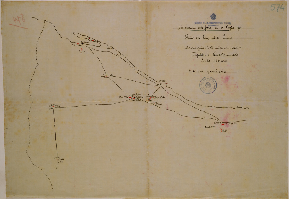 DISLOCAZIONE DELLA FORZA AL 1 LUGLIO 1914 PRESIDI DELLA ZONA ESCLUSO ZUARA DA SOVRAPPORSI ALLO SCHIZZO DIMOSTRATIVO DELLA TRIPOLITANIA NORD - OCCIDENTALE