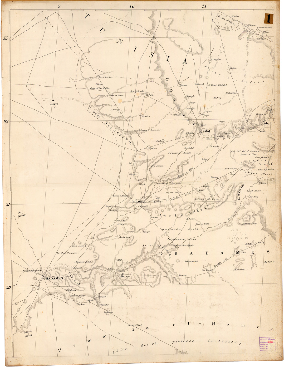"Originali disegnati dalla Divisione Artistica dell' IGM per conto del Comando del Corpo di Stato Maggiore sulla base di documenti forniti dal Comando stesso, rappresentano il territorio compreso fra il confine Tunisino e Alessandria d' Egitto. Il disegno molto schematico e la grandezza dei segni indicano che la riproduzione e la stampa devono essere state eseguite ad una scala molto più grande, vi sono indicati, con nome e data, gli itinerari percorsi dai principali esploratori del XIX secolo."