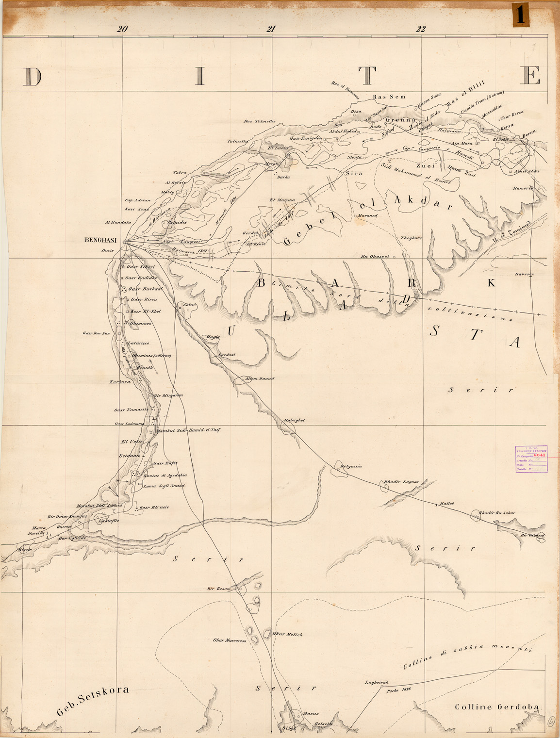 "Originali disegnati dalla Divisione Artistica dell' IGM per conto del Comando del Corpo di Stato Maggiore sulla base di documenti forniti dal Comando stesso, rappresentano il territorio compreso fra il confine Tunisino e Alessandria d' Egitto. Il disegno molto schematico e la grandezza dei segni indicano che la riproduzione e la stampa devono essere state eseguite ad una scala molto più grande, vi sono indicati, con nome e data, gli itinerari percorsi dai principali esploratori del XIX secolo."