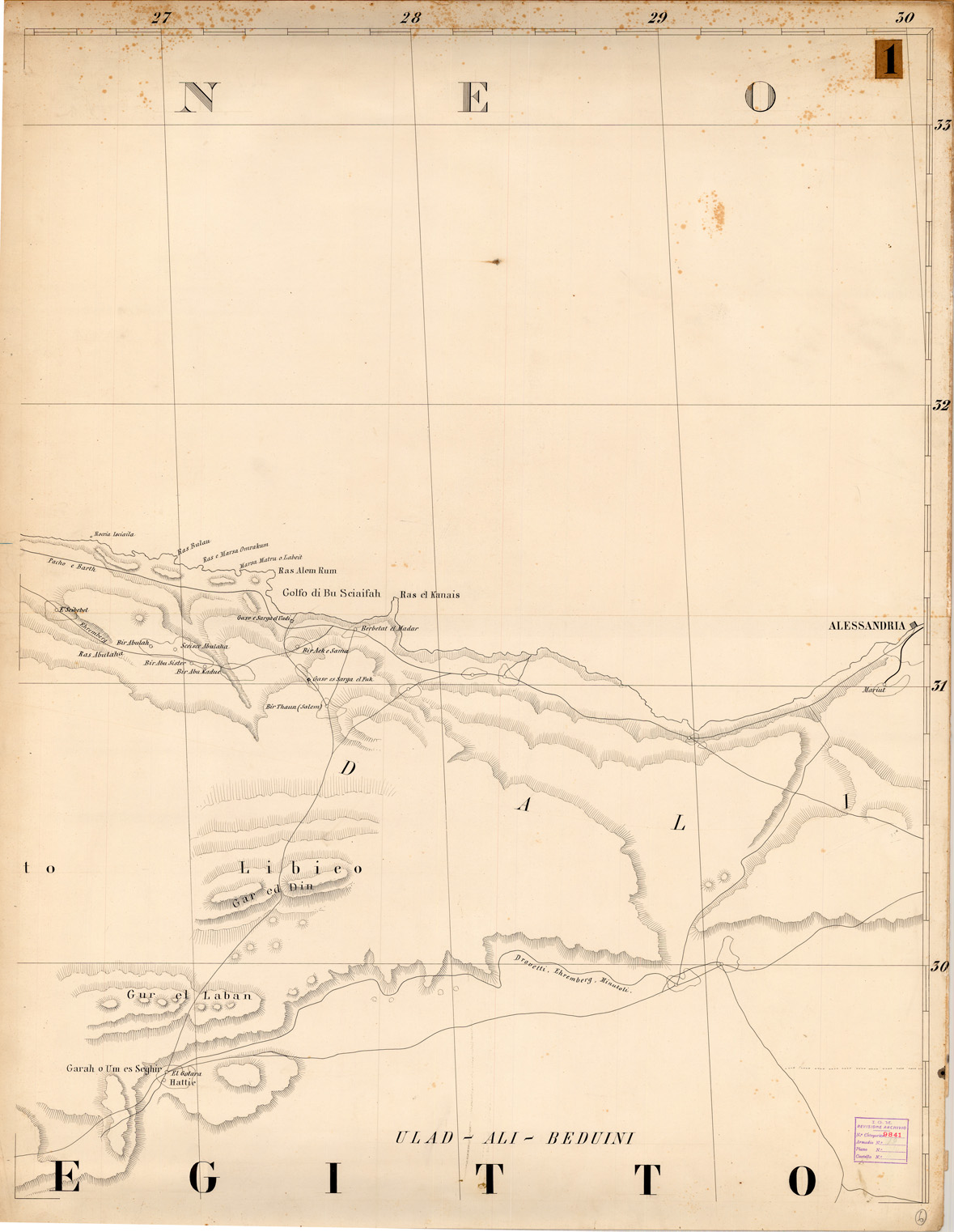 "Originali disegnati dalla Divisione Artistica dell' IGM per conto del Comando del Corpo di Stato Maggiore sulla base di documenti forniti dal Comando stesso, rappresentano il territorio compreso fra il confine Tunisino e Alessandria d' Egitto. Il disegno molto schematico e la grandezza dei segni indicano che la riproduzione e la stampa devono essere state eseguite ad una scala molto più grande, vi sono indicati, con nome e data, gli itinerari percorsi dai principali esploratori del XIX secolo."