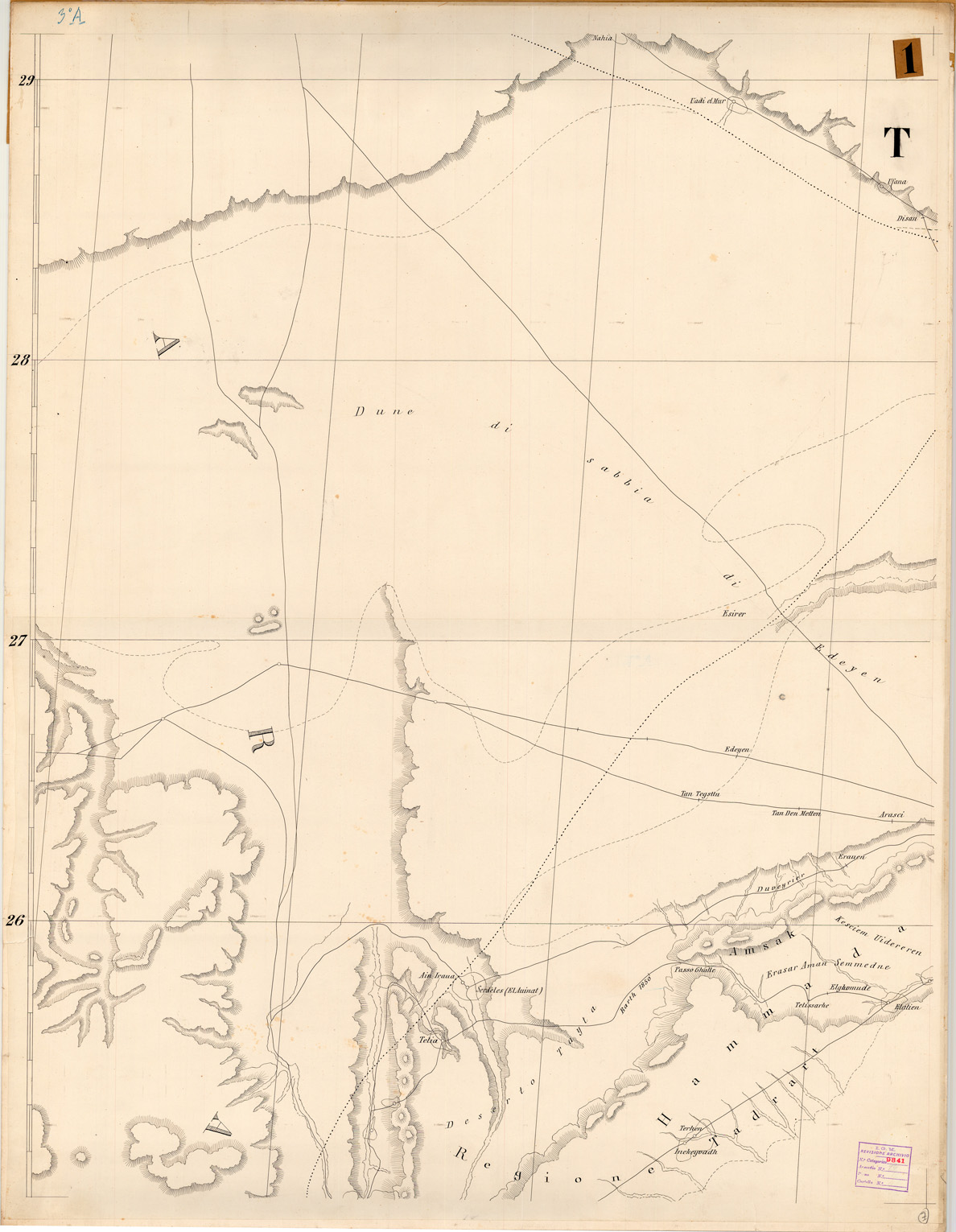 "Originali disegnati dalla Divisione Artistica dell' IGM per conto del Comando del Corpo di Stato Maggiore sulla base di documenti forniti dal Comando stesso, rappresentano il territorio compreso fra il confine Tunisino e Alessandria d' Egitto. Il disegno molto schematico e la grandezza dei segni indicano che la riproduzione e la stampa devono essere state eseguite ad una scala molto più grande, vi sono indicati, con nome e data, gli itinerari percorsi dai principali esploratori del XIX secolo."