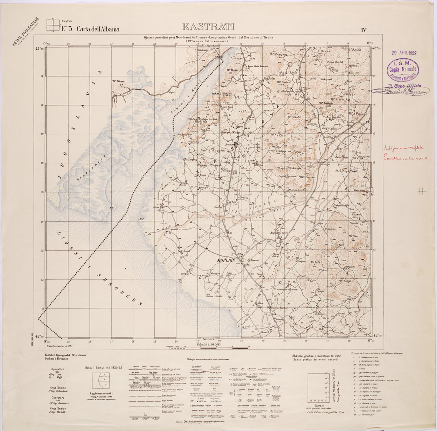 "Rilievo diretto e aerofotogrammetrico. Proiezione Autalica (Conica Sinusoidale) detta di Bonne, elementi dell'ellissoide di Bessel. Stampa in nero per i primi rilievi e per l'edizione provvisoria,per i piu' recenti stampa a colori. Equidistanza delle curve m.25."