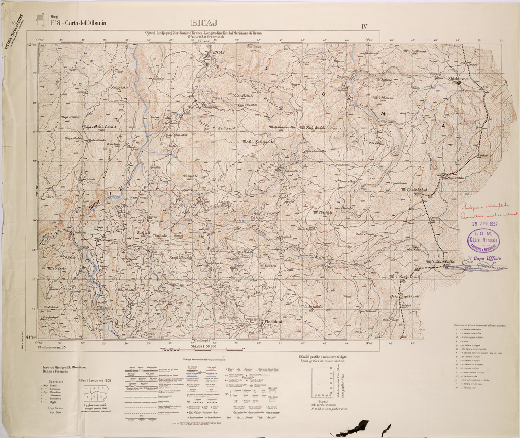 "Rilievo diretto e aerofotogrammetrico. Proiezione Autalica (Conica Sinusoidale) detta di Bonne, elementi dell'ellissoide di Bessel. Stampa in nero per i primi rilievi e per l'edizione provvisoria,per i piu' recenti stampa a colori. Equidistanza delle curve m.25."