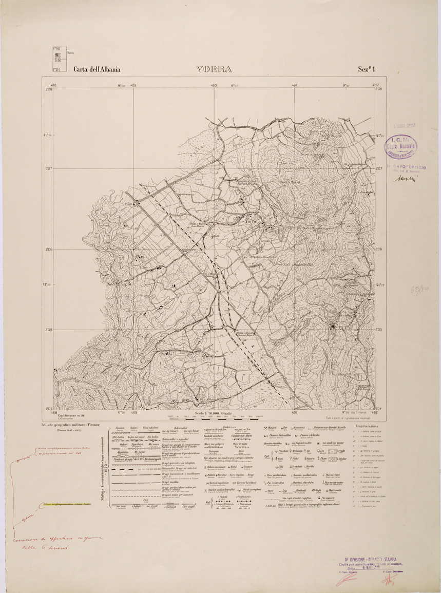 "Carta compilata dall' IGM nel 1942 usufruendo dei punti a terra determinati in campagna per i rilievi alla scala di 1:50.000 e, per alcune zone sfruttando i rilievi diretti alla scala di 1:5.000 del 1927 - 1929 ( S.A.R.A. IGM ) fotogrammi, documenti e ricognizioni del 1936 stampa 1943. Carta realizzata per l' Ufficio Centrale di Statistica del Regno d' Albania in accordo con la Milizia Forestale e con la Direzione del Catasto Agrario allo scopo di ricavare gli elementi base per la progettazione di opere di bonifica e sistemazione agraria e forestale."