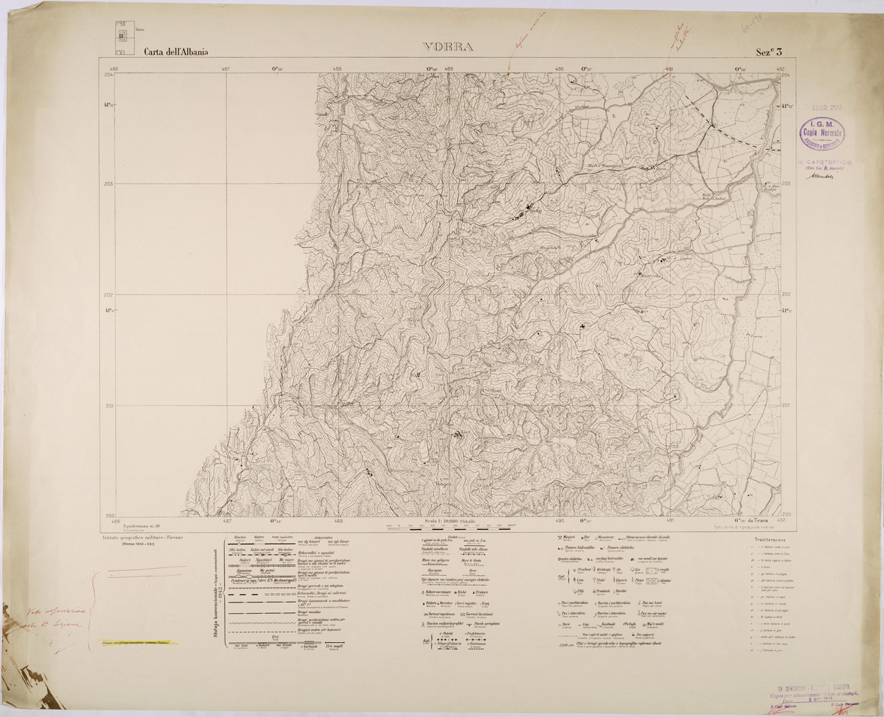 "Carta compilata dall' IGM nel 1942 usufruendo dei punti a terra determinati in campagna per i rilievi alla scala di 1:50.000 e, per alcune zone sfruttando i rilievi diretti alla scala di 1:5.000 del 1927 - 1929 ( S.A.R.A. IGM ) fotogrammi, documenti e ricognizioni del 1936 stampa 1943. Carta realizzata per l' Ufficio Centrale di Statistica del Regno d' Albania in accordo con la Milizia Forestale e con la Direzione del Catasto Agrario allo scopo di ricavare gli elementi base per la progettazione di opere di bonifica e sistemazione agraria e forestale."
