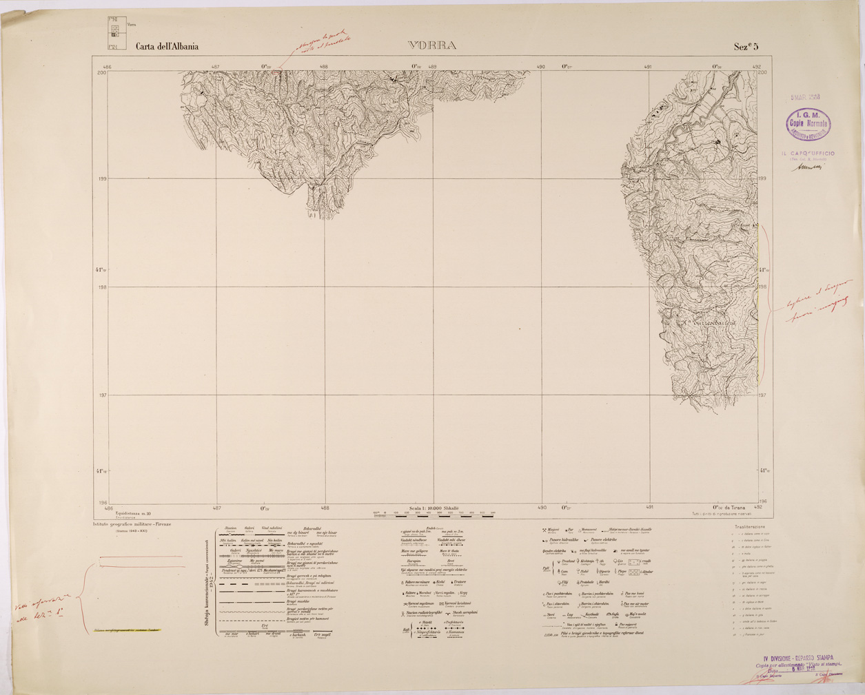 "Carta compilata dall' IGM nel 1942 usufruendo dei punti a terra determinati in campagna per i rilievi alla scala di 1:50.000 e, per alcune zone sfruttando i rilievi diretti alla scala di 1:5.000 del 1927 - 1929 ( S.A.R.A. IGM ) fotogrammi, documenti e ricognizioni del 1936 stampa 1943. Carta realizzata per l' Ufficio Centrale di Statistica del Regno d' Albania in accordo con la Milizia Forestale e con la Direzione del Catasto Agrario allo scopo di ricavare gli elementi base per la progettazione di opere di bonifica e sistemazione agraria e forestale."