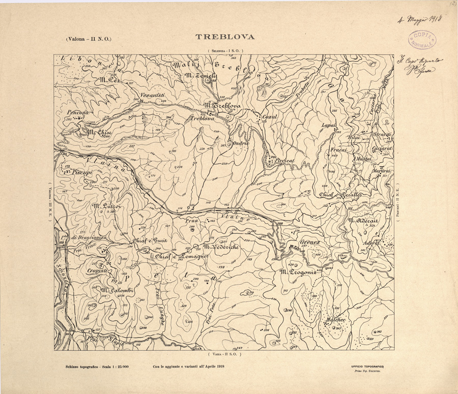 "Carta ricavata mediante ingrandimento fotomeccanico dai rilievi alla scala di 1:50.000 dalla Sezione Cartografica del Comando XVI Corpo d' Armata in Albania."