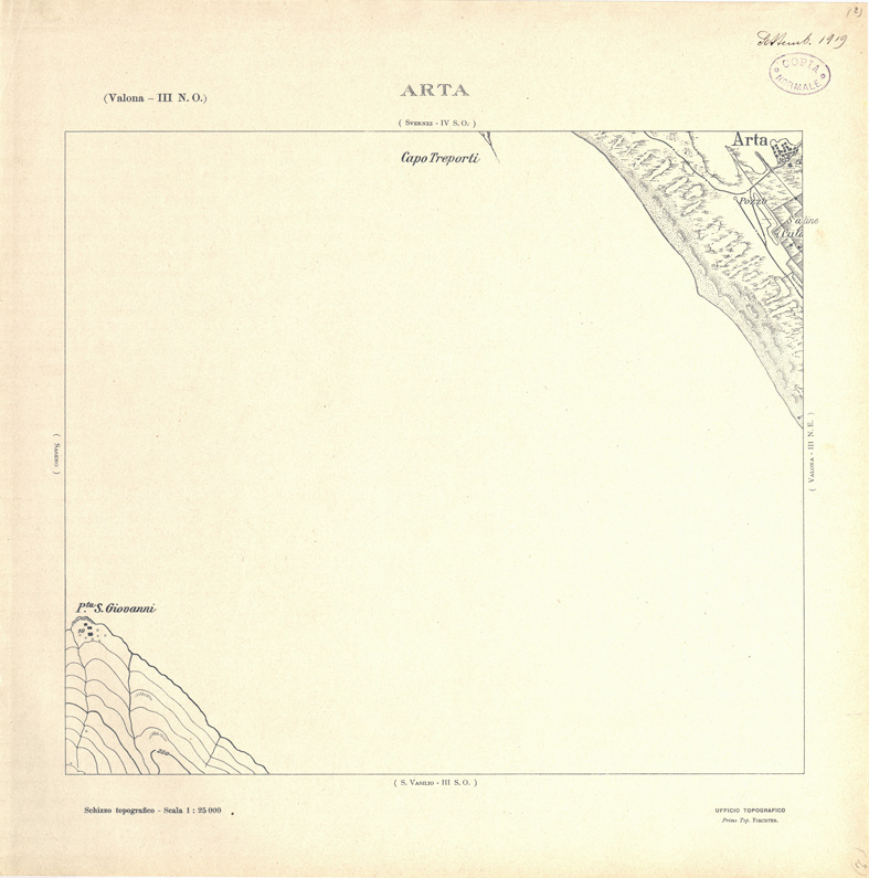 "Carta ricavata mediante ingrandimento fotomeccanico dai rilievi alla scala di 1:50.000 dalla Sezione Cartografica del Comando XVI Corpo d' Armata in Albania."