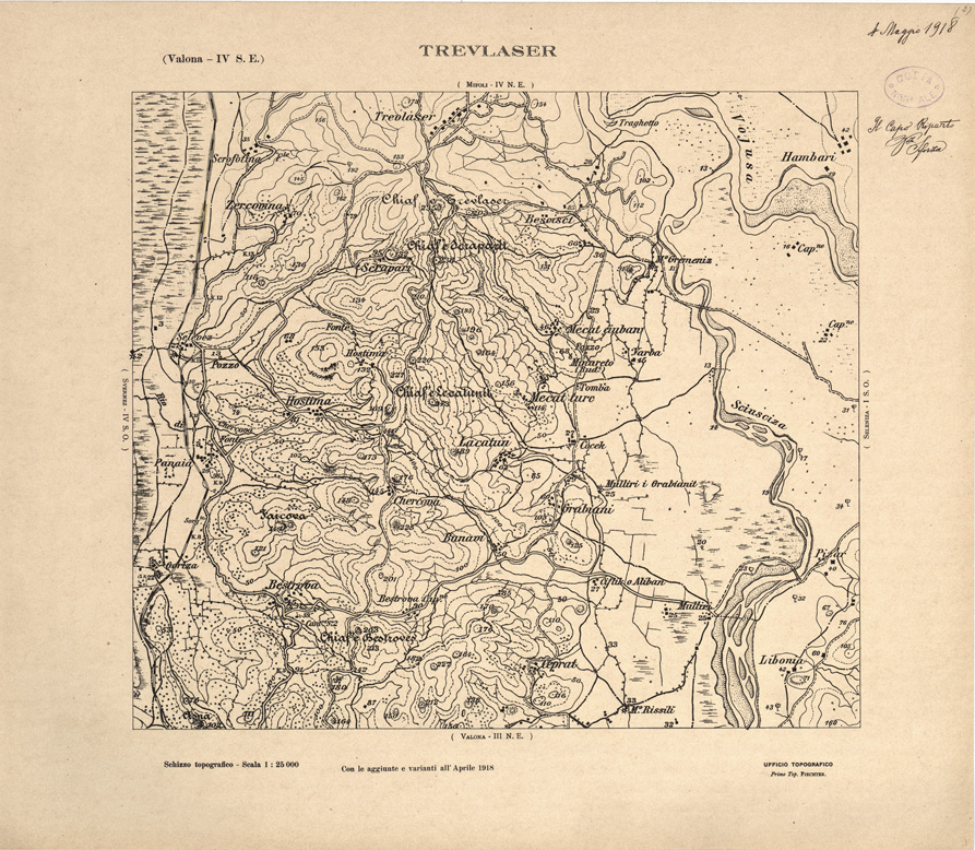 "Carta ricavata mediante ingrandimento fotomeccanico dai rilievi alla scala di 1:50.000 dalla Sezione Cartografica del Comando XVI Corpo d' Armata in Albania."
