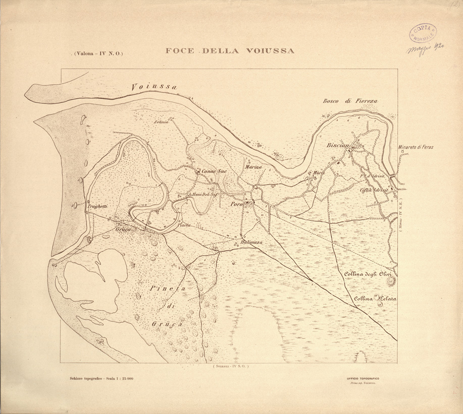 "Carta ricavata mediante ingrandimento fotomeccanico dai rilievi alla scala di 1:50.000 dalla Sezione Cartografica del Comando XVI Corpo d' Armata in Albania."