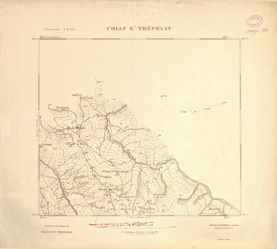 "Carta ricavata mediante ingrandimento fotomeccanico dai rilievi alla scala di 1:50.000 dalla Sezione Cartografica del Comando XVI Corpo d' Armata in Albania."