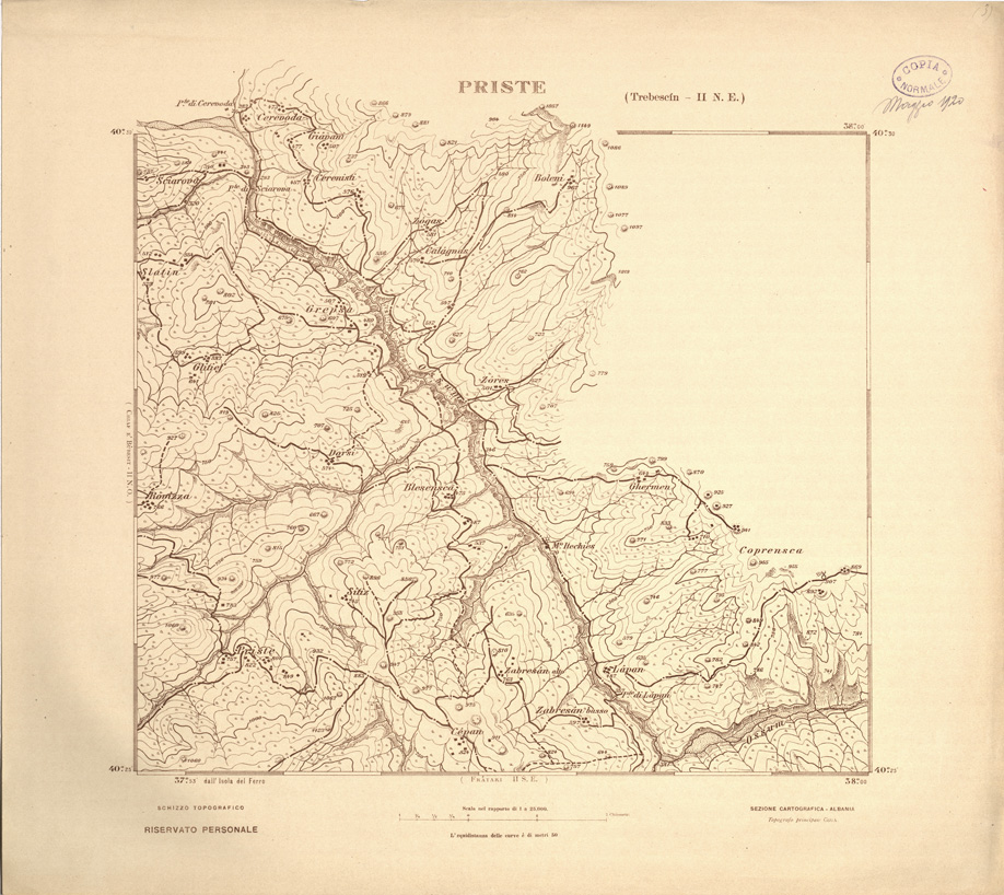 "Carta ricavata mediante ingrandimento fotomeccanico dai rilievi alla scala di 1:50.000 dalla Sezione Cartografica del Comando XVI Corpo d' Armata in Albania."