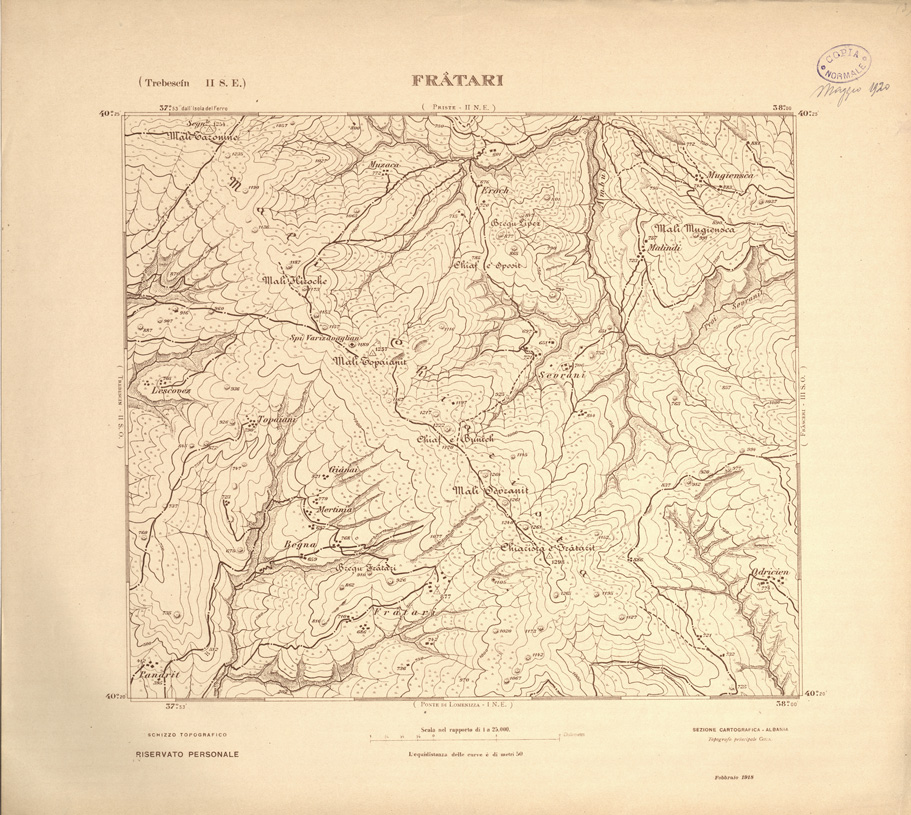 "Carta ricavata mediante ingrandimento fotomeccanico dai rilievi alla scala di 1:50.000 dalla Sezione Cartografica del Comando XVI Corpo d' Armata in Albania."