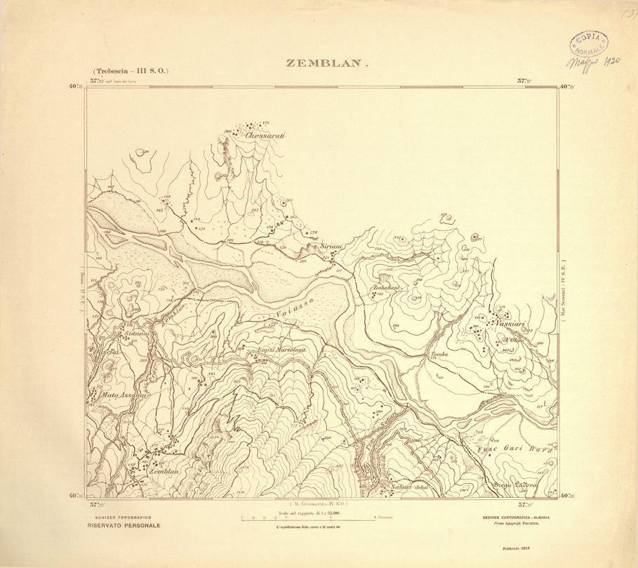 "Carta ricavata mediante ingrandimento fotomeccanico dai rilievi alla scala di 1:50.000 dalla Sezione Cartografica del Comando XVI Corpo d' Armata in Albania."