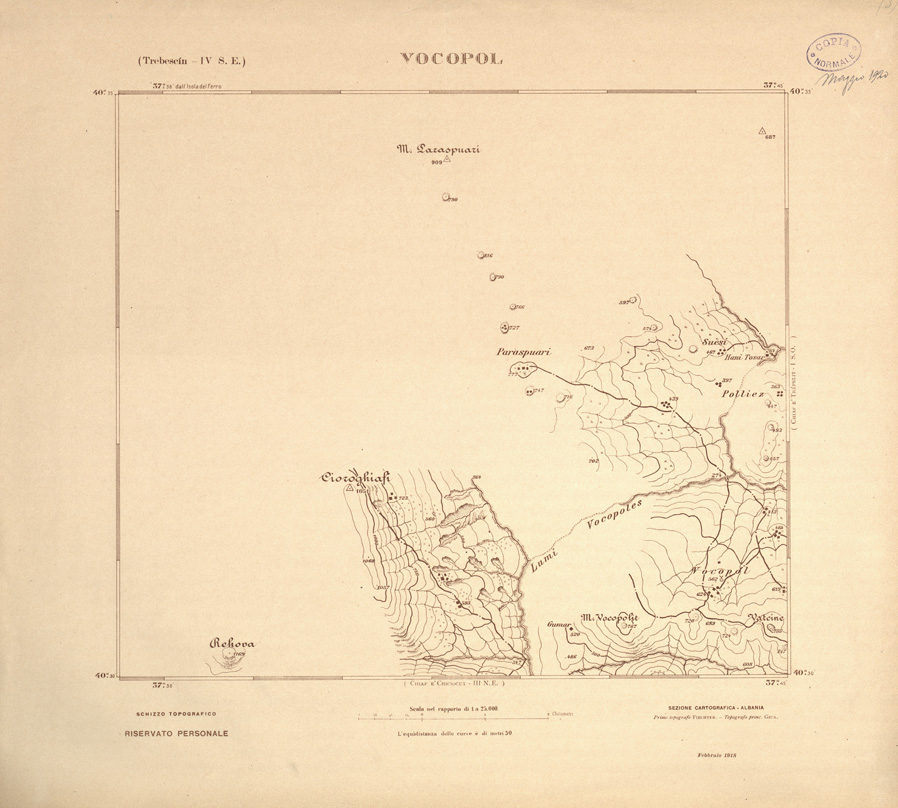 "Carta ricavata mediante ingrandimento fotomeccanico dai rilievi alla scala di 1:50.000 dalla Sezione Cartografica del Comando XVI Corpo d' Armata in Albania."