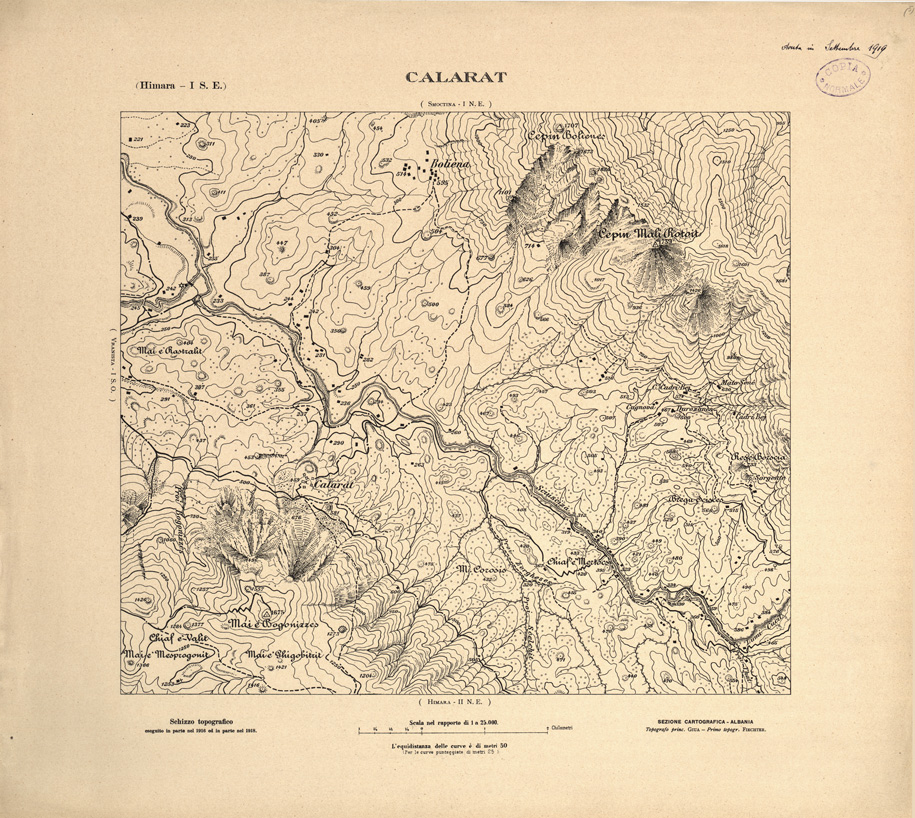 "Carta ricavata mediante ingrandimento fotomeccanico dai rilievi alla scala di 1:50.000 dalla Sezione Cartografica del Comando XVI Corpo d' Armata in Albania."