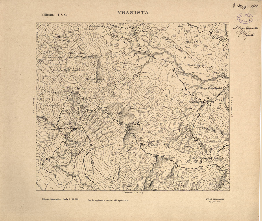 "Carta ricavata mediante ingrandimento fotomeccanico dai rilievi alla scala di 1:50.000 dalla Sezione Cartografica del Comando XVI Corpo d' Armata in Albania."