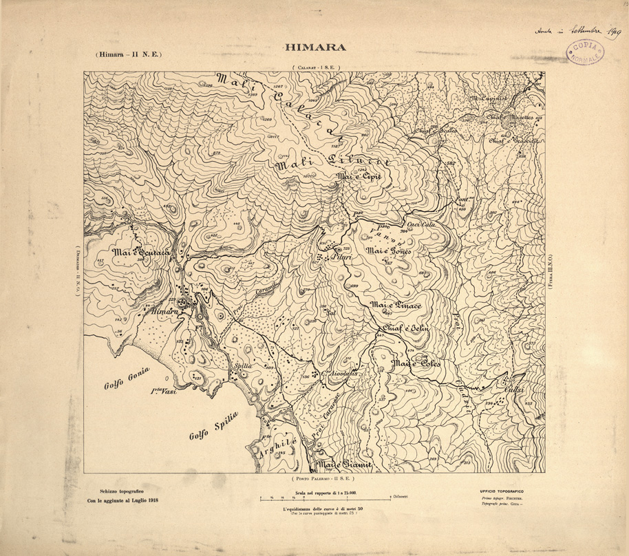 "Carta ricavata mediante ingrandimento fotomeccanico dai rilievi alla scala di 1:50.000 dalla Sezione Cartografica del Comando XVI Corpo d' Armata in Albania."