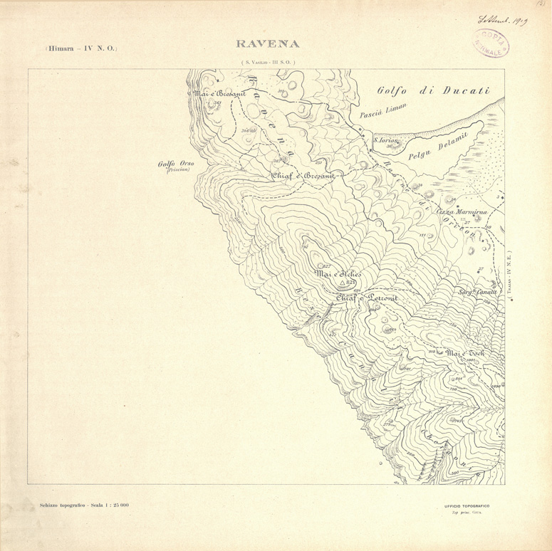 "Carta ricavata mediante ingrandimento fotomeccanico dai rilievi alla scala di 1:50.000 dalla Sezione Cartografica del Comando XVI Corpo d' Armata in Albania."