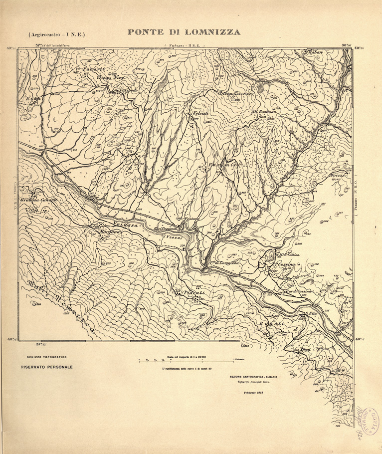 "Carta ricavata mediante ingrandimento fotomeccanico dai rilievi alla scala di 1:50.000 dalla Sezione Cartografica del Comando XVI Corpo d' Armata in Albania."