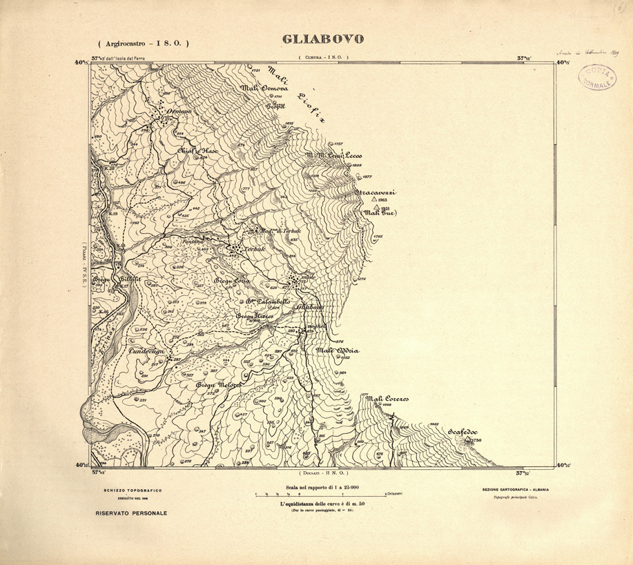 "Carta ricavata mediante ingrandimento fotomeccanico dai rilievi alla scala di 1:50.000 dalla Sezione Cartografica del Comando XVI Corpo d' Armata in Albania."