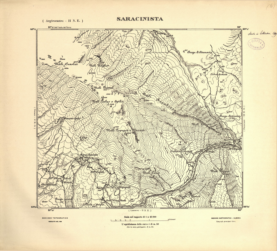 "Carta ricavata mediante ingrandimento fotomeccanico dai rilievi alla scala di 1:50.000 dalla Sezione Cartografica del Comando XVI Corpo d' Armata in Albania."