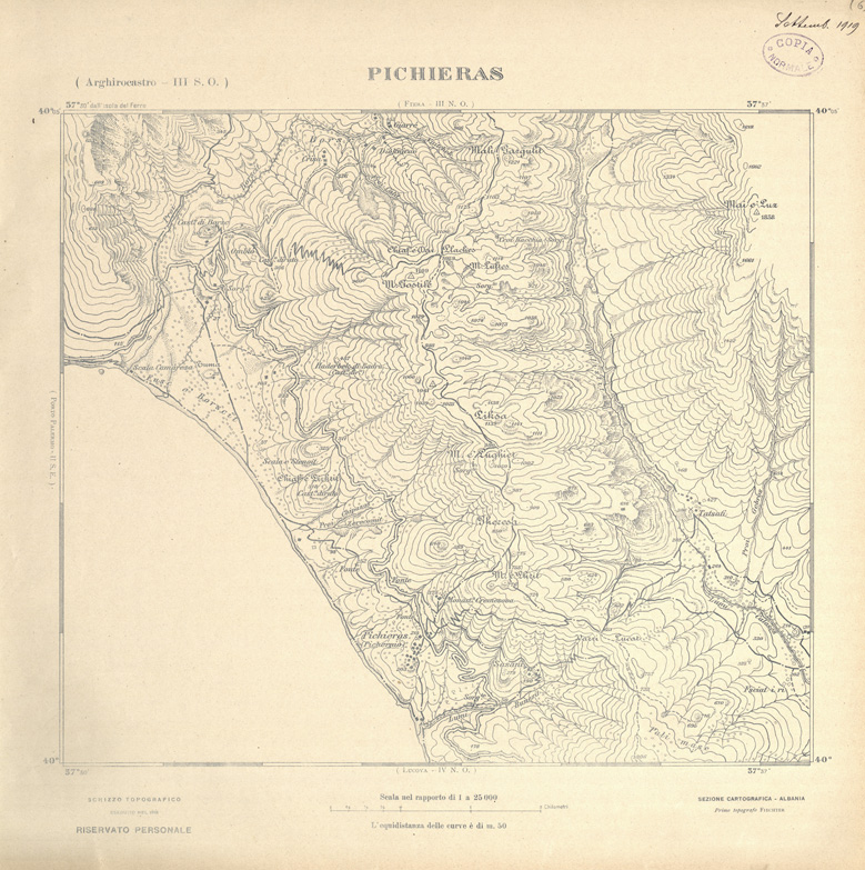 "Carta ricavata mediante ingrandimento fotomeccanico dai rilievi alla scala di 1:50.000 dalla Sezione Cartografica del Comando XVI Corpo d' Armata in Albania."