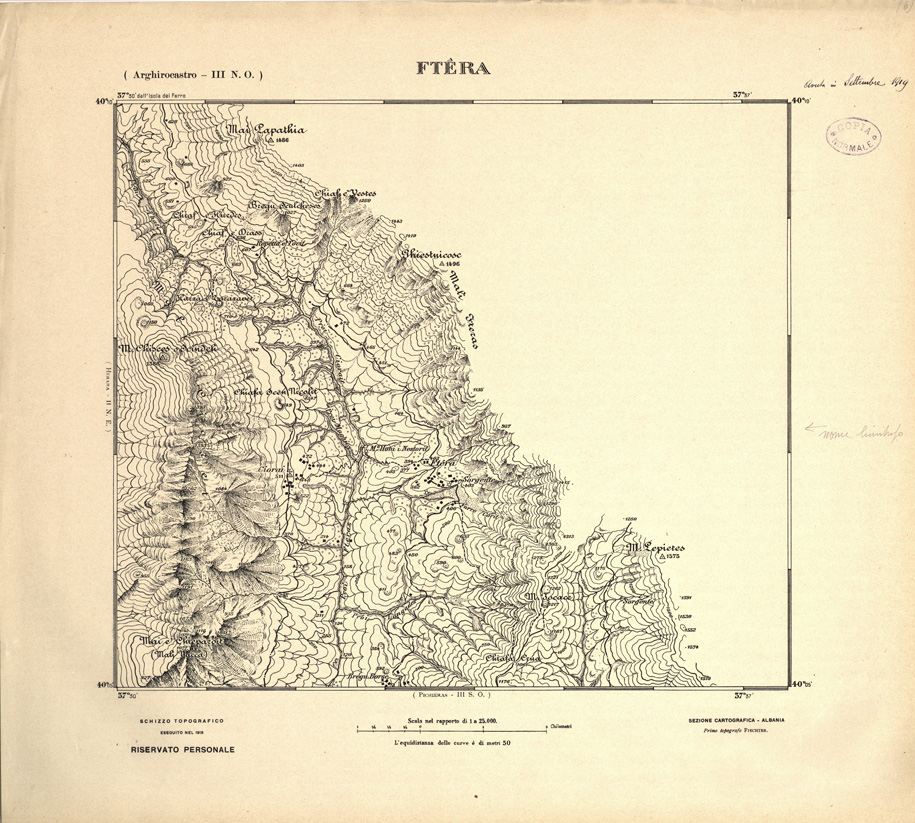 "Carta ricavata mediante ingrandimento fotomeccanico dai rilievi alla scala di 1:50.000 dalla Sezione Cartografica del Comando XVI Corpo d' Armata in Albania."