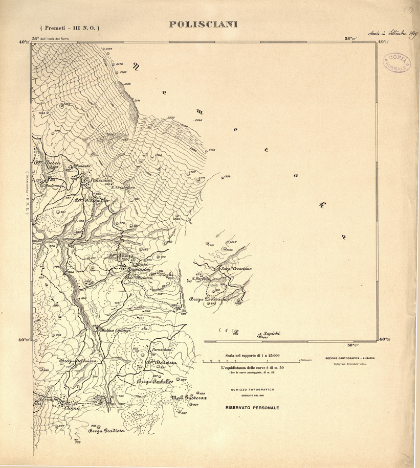 "Carta ricavata mediante ingrandimento fotomeccanico dai rilievi alla scala di 1:50.000 dalla Sezione Cartografica del Comando XVI Corpo d' Armata in Albania."