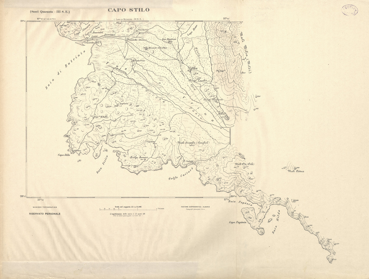 "Carta ricavata mediante ingrandimento fotomeccanico dai rilievi alla scala di 1:50.000 dalla Sezione Cartografica del Comando XVI Corpo d' Armata in Albania."