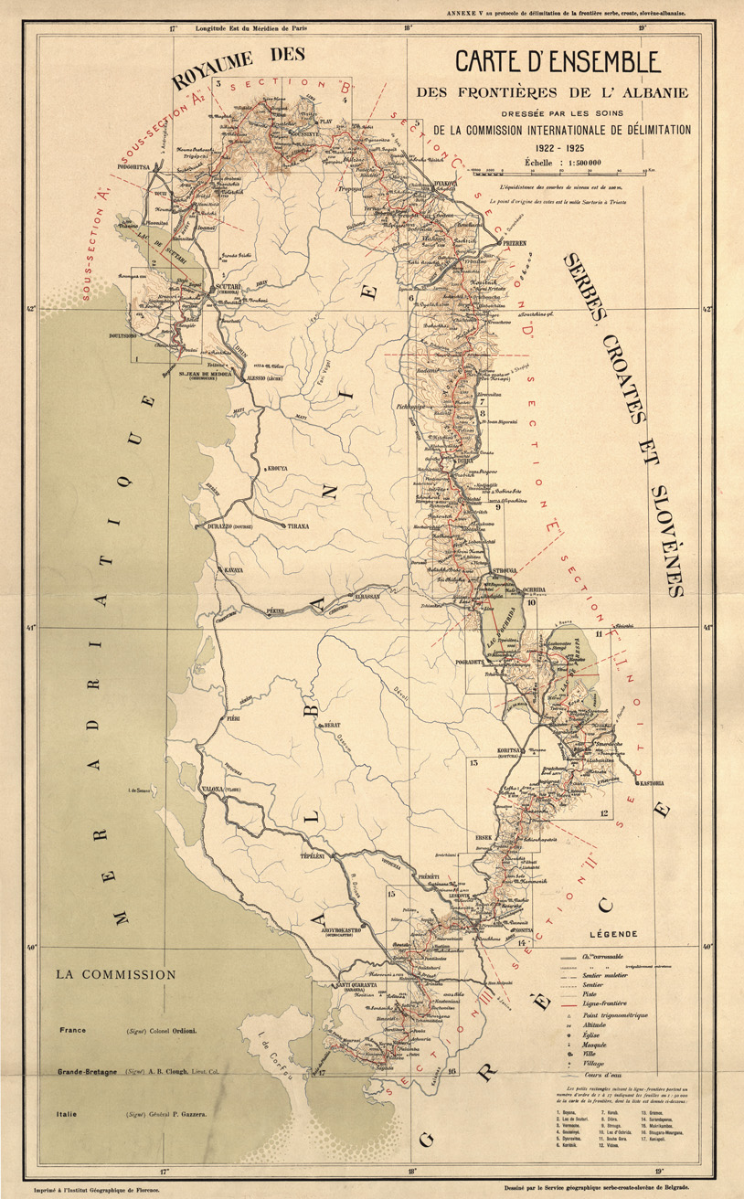 "Carta realizzata dall' IGM su rilievi eseguiti in parte da operatori Italiani e in parte da operatori Jugoslavi e Greci, utilizzata a corredo dei protocolli firmati a Firenze il 27 Gennaio 1925 per la frontiera Greco - Albanese e il 26 Luglio 1926 per quella Albanese - Jugoslava dalla Commissione Internazionale di delimitazione dei Confini comprende anche una carta d' insieme alla scala di 1:500.000 e una alla scala di 1:1.000.000 riportante i punti trigonometrici impiegati per la costruzione."