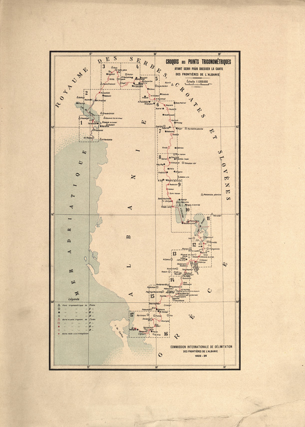 "Carta realizzata dall' IGM su rilievi eseguiti in parte da operatori Italiani e in parte da operatori Jugoslavi e Greci, utilizzata a corredo dei protocolli firmati a Firenze il 27 Gennaio 1925 per la frontiera Greco - Albanese e il 26 Luglio 1926 per quella Albanese - Jugoslava dalla Commissione Internazionale di delimitazione dei Confini comprende anche una carta d' insieme alla scala di 1:500.000 e una alla scala di 1:1.000.000 riportante i punti trigonometrici impiegati per la costruzione."