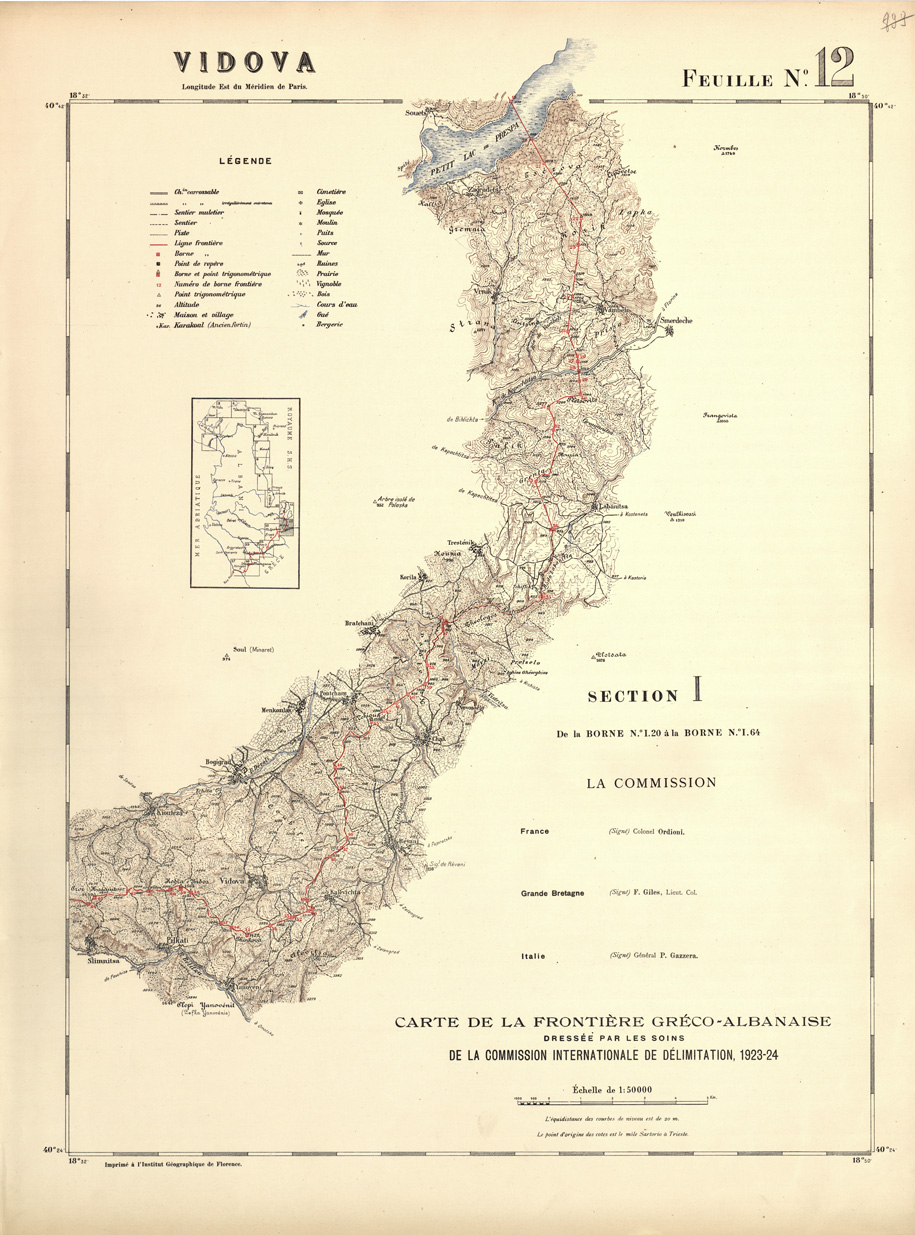 "Carta realizzata dall' IGM su rilievi eseguiti in parte da operatori Italiani e in parte da operatori Jugoslavi e Greci, utilizzata a corredo dei protocolli firmati a Firenze il 27 Gennaio 1925 per la frontiera Greco - Albanese e il 26 Luglio 1926 per quella Albanese - Jugoslava dalla Commissione Internazionale di delimitazione dei Confini comprende anche una carta d' insieme alla scala di 1:500.000 e una alla scala di 1:1.000.000 riportante i punti trigonometrici impiegati per la costruzione."