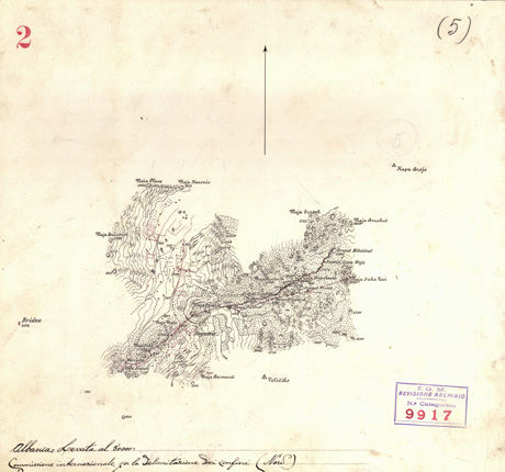 "Rilievi disegnati a penna su carta da disegno montata su tela, sono 23 spezzoni di confine su 12 tavole realizzati nel 1913 dalla Commissione Italo - Austriaca per la delimitazione dei confini Nord - Orientali dell' Albania."