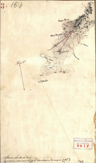 "Rilievi disegnati a penna su carta da disegno montata su tela, sono 23 spezzoni di confine su 12 tavole realizzati nel 1913 dalla Commissione Italo - Austriaca per la delimitazione dei confini Nord - Orientali dell' Albania."