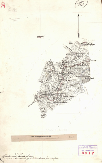 "Rilievi disegnati a penna su carta da disegno montata su tela, sono 23 spezzoni di confine su 12 tavole realizzati nel 1913 dalla Commissione Italo - Austriaca per la delimitazione dei confini Nord - Orientali dell' Albania."